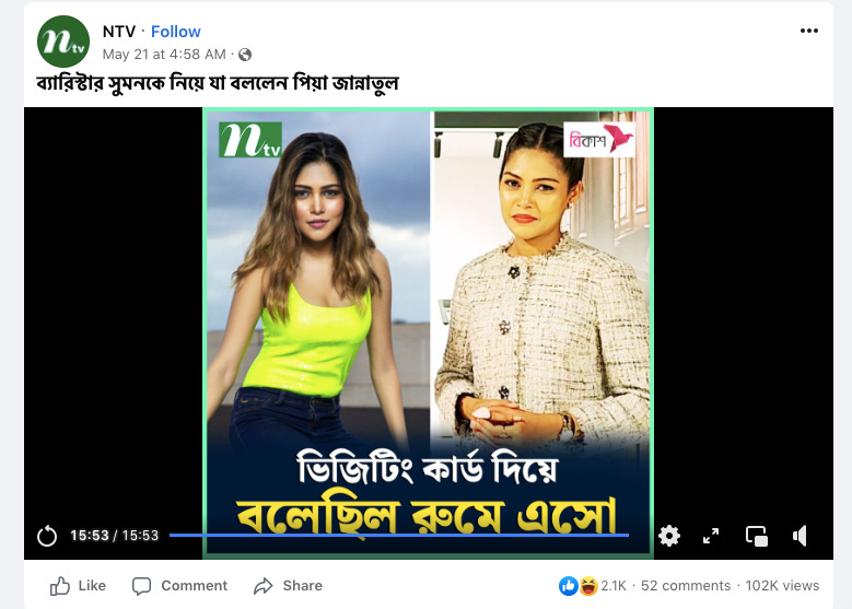 ৫। স্ক্রিনশটে দেখতে পাচ্ছেন এনটিভির করা একটা স্বাক্ষাতকার ভিডিও, যেখানে দেশের একজন মডেল তার স্ট্রাগল ইত্যাদি নিয়ে মোটিভেশনাল কথাবার্তা বলেছেন। এই ভিডিওটার যে উপস্থাপন, পত্রিকার পক্ষ থেকে এটি অসৎ সাংবাদিকতা।